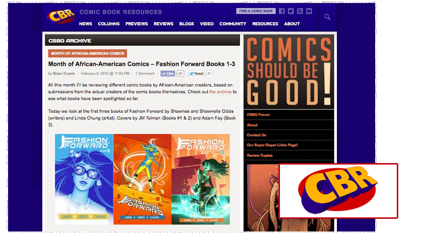 FEB. 2015 -- (Comic Book Resources) Comic Book Resources calls Fashion Forward, "one charming comic book adventure" in this feature for Comics Should Be Good's spotlight on African American creators. Article by Brian Cronin.