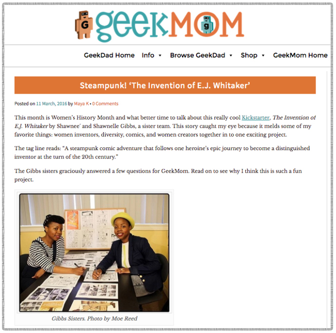 MARCH 2016 -- (GeekMom) Shawnee´& Shawnelle Gibbs chat with Geek Mom about their animation backgrounds and how it aides in comic writing, and their decision to crowdfund their new comic, "The Invention of E.J. Whitaker." Maya K.