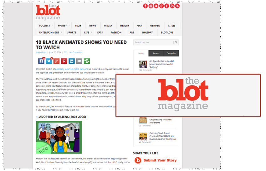 JUNE, 2014 -- (The Blot Magazine) "Adopted By Aliens" named one of the "10 Black Animated Shows You Need To Watch" amongst a roster of animated classics including "Black Dynamite," "Boondocks," "Fat Albert" and "The Proud Family." Article by Jason Gross.