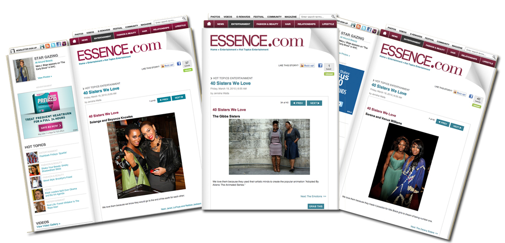 APRIL, 2010 -- The Gibbs Sisters are featured in Essence.com's "40 Sisters We Love," article celebrating Essence magazine's 40th year of publication. Other sisters include Beyonce and Solange Knowles, Venus and Serena Willams, and Angela and Vanessa Simmons.